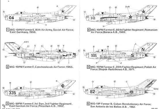 Though not exactly the most well known or even the most effective aircraft ever built by the Soviets, the MiG-19 was certainly one of the coolest aircraft of the period. Powered by two afterburning turbojets, it was the USSR's first supersonic fighter. A bear to handle by the inexperienced, it also had a rather short range and rarely came out the best the few times it was involved in air combat. This particular sheet is for the radar nosed MiG-19P/PM (the PM having only missile armament). For kits, you are pretty well stuck with the Trumpeter offering. It is unfortunate that there has yet to be a really good MiG-19 built and one can only hope that soon someone will produce one.