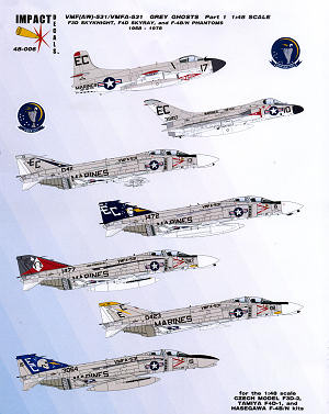 This one is no exception, covering the aircraft of VMFA-531 Grey Ghosts from 1958 to 1972. All of the aircraft are in light gull grey and white, my favorite camouflage scheme and offer seven different schemes, most of them Phantoms. There are kits for all these options with the Skyknight being done by Czech Model (good luck in finding one), the Skyray by Tamiya, and the Phantoms by Hasegawa. It is recommended for the early versions to buy the F-4J kit due to its engraved panel lines, and get a Royal Resins conversion set. That company can also be used for the unslotted stabs.