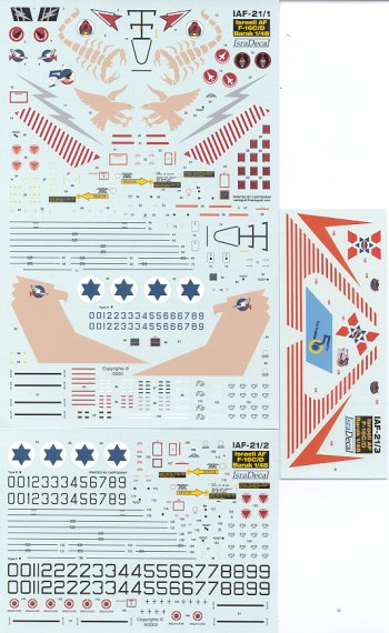 Not to say the profiles are gone as they are still there, just in shades of grey instead. All the markings are carefully numbered and exact locations shown. As with the previous 1/72 sheet, this one has full data markings in both English and Hebrew for those that have been repainted. Code numbers are provided to allow about any of the aircraft in service to be duplicated. All of the units are represented including First Jet Squadron, Valley Squadron, Knights of the North Squadron, First Fighter Squadron, Scorpion Squadron and the Test and Evaluation Unit.