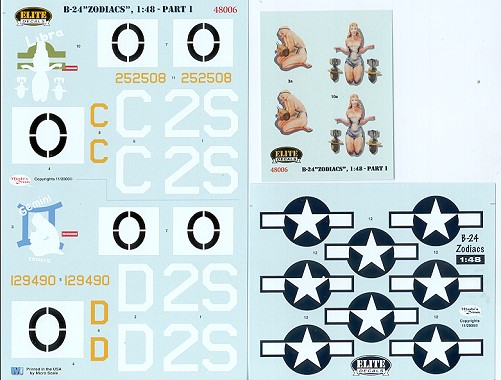 On this sheet are markings for two 'Zodiac' B-24Hs. The kit for these is the Revell/Monogram kit and while it is not really a B-24H, but a B-24J, the differences are relatively minor. The modeler will have to research this as the instructions provide no background information, just the decal placement guide.