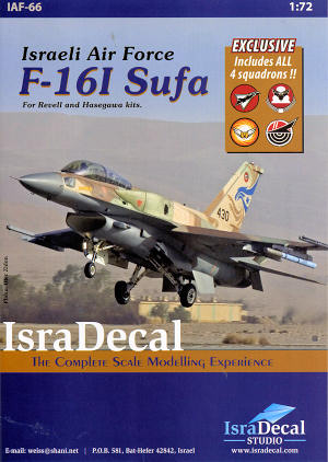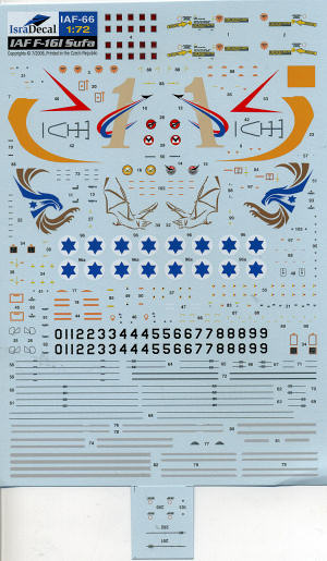 APG-68(V)9 radar.So says Wikipedia. As Isradecal has some interest in doing IAF subjects, it is no surprise that there is a sheet dedicated to this most interesting of the F-16 variants. Set 66 allows the builder the chance to build any aircraft of any of the four squadrons operating the type. Modelers will need the Hasegawa or Revell F-16 kit and the Isracast conversion set to build one of these, but the set is quite complete.