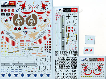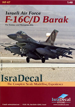 This sheet from Isradecal has markings enough to be able to build almost any IAF F-16C/D that has ever served. Some may recall that this aircraft was featured in an earlier sheet. That one is out of print and this one has added in the new units and markings that have come into being over the last several years. The large and well printed sheets are done in the Czech Republic and appear to be quite thin and opaque. Included with the multiplicity of sheets is a set of gummed back masks for painting on the large eagle currently worn on the fin of Knights of the North squadron planes. There are enough data markings and insignia to enable the modeler to build two aircraft. I am not sure of the availability of an IAF version F-16D so one may need to get a conversion set. The full color 8 page instruction booklet does not mention a conversion, but I'm sure one is available. This booklet should be studied carefully to ensure that your choice of markings has all the appropriate details. For kits, the Hasegawa and Tamiya kits are recommended. As with all of IsraDecal's products, this one is highly recommended.