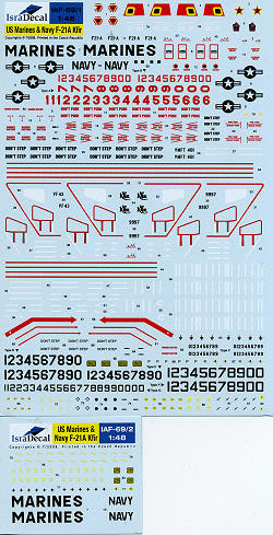 There are enough data markings and insignia to enable the modeler to build two complete aircraft. The smaller sheet just adds a few more stencil markings and another set of Navy and Marine logos in case the builder wants to produce two Navy or two Marine aircraft. The full color 8 page instruction booklet shows the precise placement of all the markings and includes a very large stencil placement diagram.