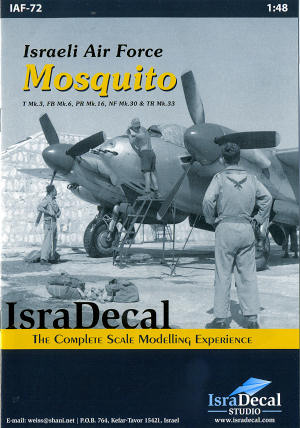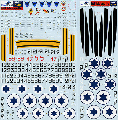 This particular sheet from Isradecal has markings enough to be able to build at least two of any of these aircraft. It seems from looking at the instructions that IAF Mosquitos did not have upper wing insignia so you have quite a few to choose from. As for the different variants, you can go a T.3, NF.30, FB.6, TR.33 and PR.16. There are also a variety of camo schemes, though most of these planes were operated in aluminum lacquer overall. Isracast even provides the black exhaust sections many planes had painted on to cover up the stains. The full color 8 page instruction booklet shows the precise placement of all the markings and includes a stencil placement diagram.