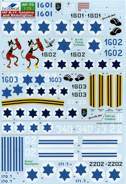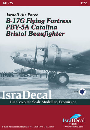 As with all their recent sheets, this one is superbly printed in the Czech Republic and totally devoid of registration errors. For kits you have a variety of choices. B-17s by Hasegawa, Academy, Airfix; Catalinas by Academy and Airfix and Revell with Beaufighters by Matchbox, Hasegawa and Airfix just to name those that come readily to mind. Isradecals recommends Academy for the B-17s and PBY with Hasegawa for the Beaufighter. A superlative set of markings that will make some most interesting modeling presentations.