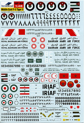 This latest sheet from Isradecal concentrates on those from what we now call the Middle East. many of these planes were bankrolled by Saudi Arabia or provided from Saudi stocks. The sheet has a variety of different schemes on it, though most of them are either an overall light grey or a desert scheme of tan, brown and dark green. There are aircraft from seven nations and you can do at least one from every nation on the sheet. Isradecal also provided numbers separately so that if you can find a photo, you can probably do a model of that aircraft.