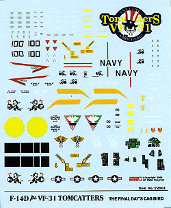 The decals themselves are well printed and quite glossy. Though the fine print is illegible, it is perfectly OK for this scale. The reds and yellows seem opaque enough to hold up to the backgrounds, something that is especially crucial for the black fins. In several cases, the decals are two part to prevent problems with registration. The other markings are spot on in terms of registration. No kit is specified, but I'm sure that most will be using the Hasegawa or Revell kit. Those are so close that any differences will be minimal. A nice additional touch is a 'Tomcatters; VF-31 decal to add to the base. Though it may seem a bit picky, I think that outlining the yellow on this decal would improve the look of things as the yellow blends in with the white behind it. Something to think about in future sheets.
