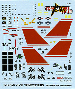 The decals themselves are well printed and quite glossy. Though the fine print is illegible, it is perfectly OK for this scale. The reds and yellows seem opaque enough to hold up to the backgrounds, something that is especially crucial for the black fins. In several cases, the decals are two part to prevent problems with registration. The other markings are spot on in terms of registration. No kit is specified, but I'm sure that most will be using the Hasegawa or Revell kit. Those are so close that any differences will be minimal. A nice additional touch is a 'Tomcatters; VF-31 decal to add to the base, this one of a different design to the previous sheet.