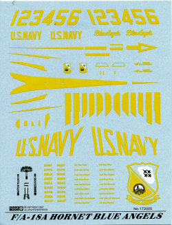 The decals are superbly printed and seem to have a white backing to all the yellow bits to prevent problems with bleed-through. The modeler may want to paint the tips of the wings, fin and stabs, but these markings are included on the sheet. There are serial/pilot tie-ins for nine aircraft. No chart is provided for any of these aside from what you can glean from the placement/painting guide for aircraft #1, but a check of www.blueangels.navy.mil may shed light as to which goes with which. I'm not sure what season this represents, but since the logos are for a 'Boeing' Hornet, it has to be within the last 10 years.