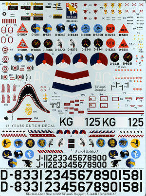 This sheet is for 1/48 fans and includes no fewer than at dozen of each of the main subjects; the T/F-104G and the early F-16 Falcons. These dozen aircraft cover every unit that has flown the Starfighter and Falcon in the Dutch Air Force.