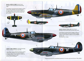 Now on to Spitfires. The sheet covers three of them. There is a lone Spit V with GCB 2/18 in May of 1945. This one is in standard RAF camouflage, as are the other two on the sheet. The yellow tailed one with all the mission markings is from GR 2/33 based at Stuttgart in May of 1945. This aircraft has clipped wings with large yellow bands on the wings. The other is from GC 1/3, also based at Stuttgart in mid 1945. No indication of what sort of wings this one has, but they look to be standard.