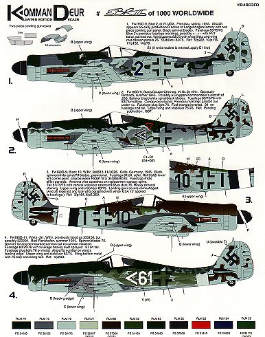 Having said all that, they look superb and will definitely be used on an upcoming FW-190D that should be complete by next edition. By the way, I was unable to find any of the FW-190D sheets in shops as they were sold out, so ordered this one direct from KommanDeur. Unfortunately the production run is ended so I had to but an overrun, which is not serialized. Cost was $11.00 a sheet.