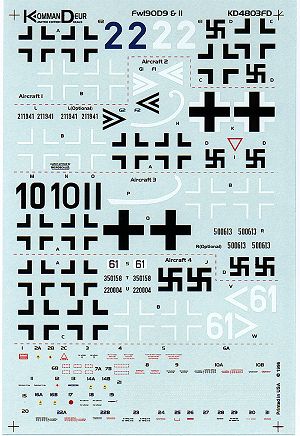 The sheet is complete with all major markings for four aircraft: Blue 2, a D-9 from IV/JG3; Black Double Chevron, a D-9 from JG-6(?); Black 10 another D-9 from III/JG26; and White Chevron 61,a D-11(unit unknown). There is enough stencilling for one aircraft and unfortunately, no guide is given. Instead, it states to use known photos or the instructions for Almark sheet 48-6. Thanks! being able to tell what the plane is from known photos is difficult enough, so I doubt they will be any real use. Heaven only knows if Almark sheet 48-6 is still available as few shops around here carry them.
