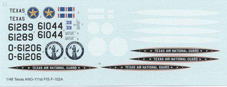 With the current (Sept 2004) flail-ex concerning President Bush's ANG service, it is quite timely that we have a new decal sheet specifically for his old unit, the 111 FIS. This sheet is superbly printed by Kedi Decals using an ALPS printer. It is so good, that even the data block can be read. Included are serials for three aircraft as well as the unique markings for one and white backgrounds for the various decals that need them. ALPS decals are printed on a single sheet and need to be carefully cut out individually.
