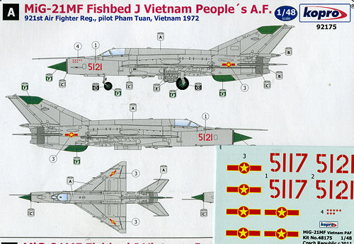This particular MiG-21 sheet from Kopro contains markings for two NVPAF aircraft. Both of them are in unpainted metal with green radomes. Both aircraft were flown by the 921st Air Fighter Regiment. The only difference between the two is in the nose number.