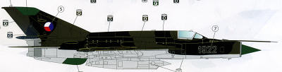 This particular MiG-21 sheet is 1/72 scale and has special markings for an aircraft of the 28th Bombardment Regiment at Caslav AFB in 1993. These special markings are on one side of the aircraft showing the dragon while on the other is Letala Bajecne Dlouho, which can be translated as "You've flown wonderfully for a long time". It refers to the situation of Czech Air Force in 90-ties. Thanks to a reader for providing this information. This aircraft is in overall unpainted metal or perhaps silver lacquer and otherwise quite standard looking.