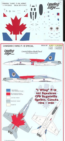 Now it appears that Leading Edge is producing some for the special commemorative schemes that have been applied to the various CF-188 Hornets over the years. This sheet for 425 squadron from 1996-98 was spotted at a model contest and quickly scarfed up. It appears that there is sufficient decal material to properly cover the kit, though it would be nice if there were some extra red and blue provided in case of mistakes. The instruction sheet hints at there being some, but I'll be darned if I could find it.