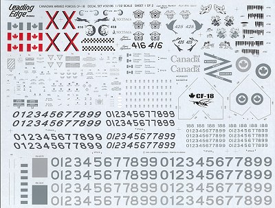 There are enough common markings to do one aircraft (two in the smaller sheets) and enough letters to do any 'non-special' CF-18A/B in the fleet. I did mention that this sheet only does current units which include 410, 416, 425, 433 and 441 Sq as well as AETE, the test unit. It also has markings for the 'Balkan Rats' along with the appropriate mission markings.