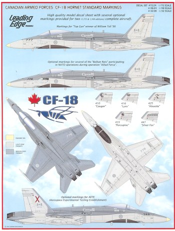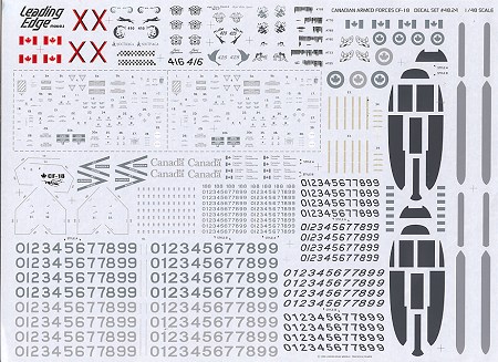 There are enough common markings to do one aircraft (two in the smaller sheets) and enough letters to do any 'non-special' CF-18A/B in the fleet. I did mention that this sheet only does current units which include 410, 416, 425, 433 and 441 Sq as well as AETE, the test unit. It also has markings for the 'Balkan Rats' along with the appropriate mission markings.