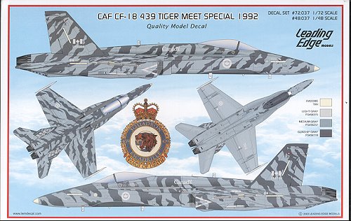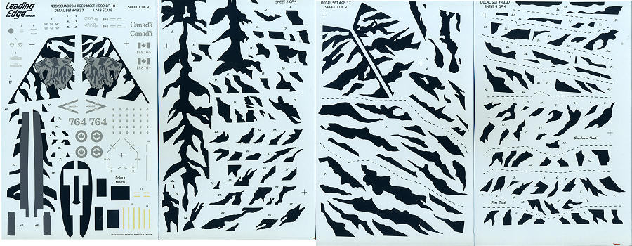 Not wanting to sound like a broken record, but once again, Leading Edge has produced a top quality decal sheet for a special scheme Canadian subject. It isn't often that a company reissues a sheet, but LED has listened to enthusiasts and we once again have this excellent set of sheets available to us. This set is for the 439 Sq 1992 Tiger Meet CF-18A. The 1/48 version has four full sheets and that is what is shown.