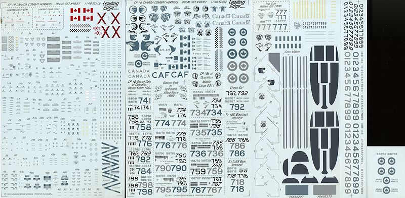 In a nutshell, this set contains markings that cover all of the major conflicts that the Canadian Hornet has been involved in. There are three major sections. One is Desert Storm in 1991 and six specific sets of markings are provided for that. Next is Operation Allied Force in the Balkans during 1999. Four aircraft are in that section. Then there is Operation Mobile in Libya during 2011 and five aircraft are included.