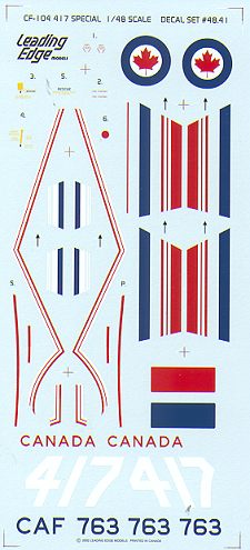 One of them is the very fetching red, white and blue painted CF-104 from 417 Sq just prior to its being stood down. Leading edge provides all of the tricky bits and requires the builder to paint the large areas of red and blue on a white aircraft. As with all Leading Edge sheets, rectangles of the main colors are provided to allow the builder to match the paint colors. A very nice touch that is not often considered with other companies. In addition, there is a full set of stencils in all three scale provided on the instruction sheet so that proper masking can be done.