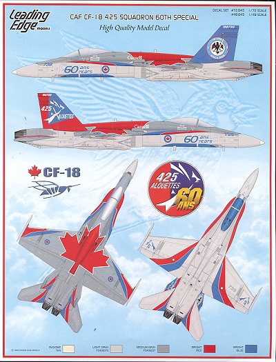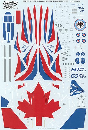 The sheet itself is superbly done and offers all of the markings needed to complete the scheme. There are also just white outlines for the large maple leaf on the upper fuselage for those of you brave enough to want to paint it in. Templates are provided as well to make this job easier. The sheet also includes the large red and blue backgrounds for the outer fins. Again, this could be painted on and in the 1/48 sheet (not shown), that is what you have to do.