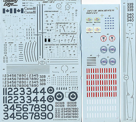 Just for information, all Canadian C-130s up to serial 130337 are C-130Es with the rest being C-130H models. The H model can also be fitted with wing refueling pods (which in 1/72 can be robbed from the Matchbox Victor kit as they are quite close). The sheet has not only a wide variety of serials and unit badges, but also full data markings, including will walk outlines. These wing walk areas were generally a lighter or darker shade from the rest of the airframe and would be matte.