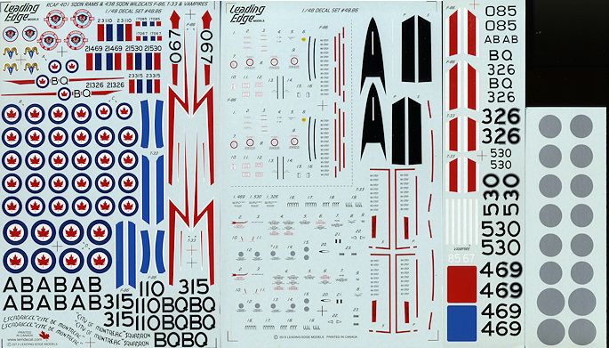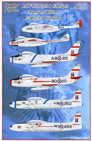 The sheet is superbly printed and includes what appears to be enough data markings and insignia for six options. There are aluminum roundels to put under the Canadian roundels on the wings, which is a big help. Not sure who does kits for the Vampire, but I'm thinking Hobbycraft and Classic Airfames. The Sabre markings are for either the Hasegawa or Academy kit. Be sure you get the boxing with the 6-3 wing and wing fences. For the T-33, Academy/Hobbycraft is still the modeler's choice though I guess you could use the old Testors/Hawk kit if you wished.