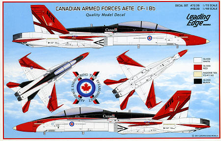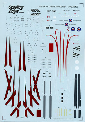 For Canada, this is the Aerospace Engineering Test Establishment (AETE). Their aircraft have, for many years, had a red X on the fin. This particular sheet covers a very impressively painted CF-18B. Now for those who wonder how they are going to duplicate this scheme, I should put your mind at ease. Leading Edge has not only provided the dark red bits, but also the lighter trim items and a set of sticky as well as paper masks to help you with properly placing everything. You will have to paint the red, but these masks (not shown because all you'd see is a green/brown rectangle) have bits for the two major Hornet kits in this scale by Hasegawa and Academy.