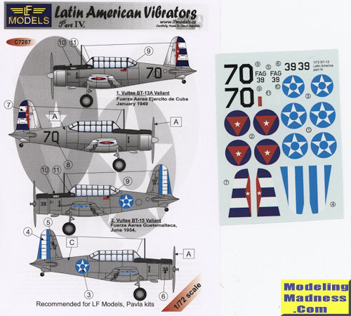This is one of several sheets produced by LF Models for Latin American BT-13s, each sheet featuring two planes. This one has an aircraft from Cuba and one from Guatemala, both from the first half of the 1950s. The Cuban plane is unpainted metal while the Guatemalan version is just listed as 'grey'. It looks a tad dark and may well be FS 16473 ADC Grey. In fact, one could surmise from the profile that the Cuban plane has a grey fuselage. One will need to do a bit of research to verify this. The sheet comes with a small sheet of paper on which are printed profiles for the left and right as well as upper and lower views.