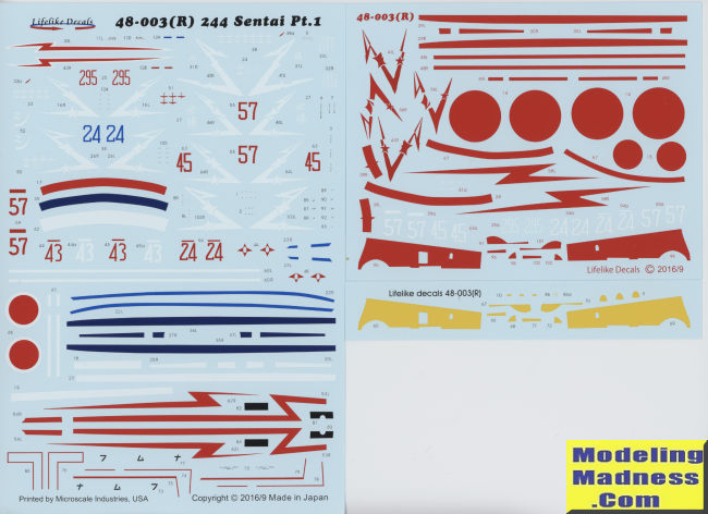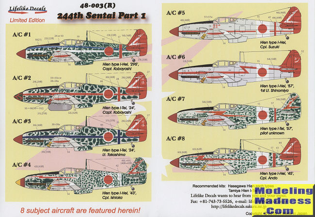 In 2002, Lifelike produced this sheet and it quickly sold out. With the release of the new Tamiya kit,it was felt that a reissue would be in order. Like the earlier sheet, this has markings for eight aircraft of the famed 244th Sentai. The aircraft are either in Kawasaki dark green mottles over unpainted metal or overall unpainted metal. Most have the white defense bands on the wings and fuselage, though the modeler will need to paint those on. You'll also need to paint the e red tails on those that have them. The sheet has insignia for one plane, but you can use kit markings for others if you so wish. This set includes two sets of wing leading edge ID markings. Yes, one is red and that is for the second option.