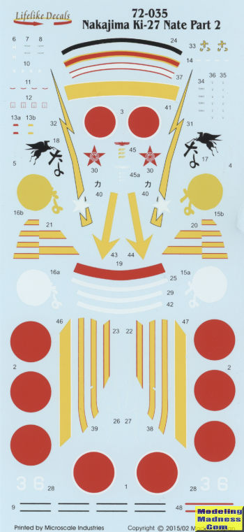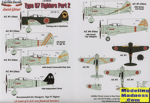 This sheet has six markings options, five of them being overall IJAAF green-grey with the sixth one having a dark green upper surface with the yellow leading edge bands. This latter option is one that was assigned to an unknown training unit in Manchuria late in the war because it has the green upper surfaces and a fuselage insignia. None of the other options have this feature.