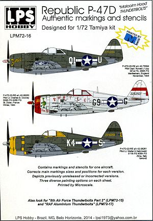 There are enough data markings and insignia for one plane. Recommended kit is by Tamiya and I'm assuming it comes with the Malcolm Hood or you'll have to go to aftermarket for it. If that is the case, then you can also used the Hasegawa and other kits. The instructions are in full color and provide additional information on each plane. A separate data placement sheet is also included. The decals themselves are produced by Microscale so are viable with just about any setting solution.