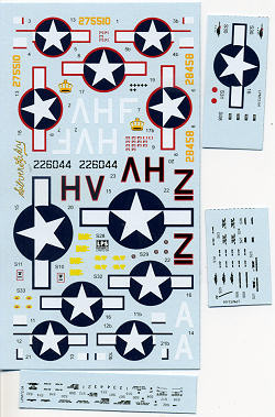 There are enough common markings and stencils to completely do one of the three options, with enough insignia to do two. You'll notice that the fuselage insignia are in sections to take care of the turbocharger waste gate doors. Of course, you can use kit decals to do the others should you so wish.