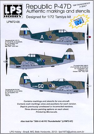 The sheet contains markings for three aircraft all marked in a similar fashion with the small SEAC roundels and the two shade blue fin flash. The two razorback P-47s have Hamilton Standard props while the bubbletop has a Curtiss-Electric version.