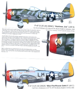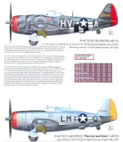 Francis Gabreski's un-named aircraft is the same model as Shilling and Christiansen's; a D-25 (that means a Hamilton Standard Prop, if I'm not mistaken). It is in the same RAF colors as Schillings and has a red rudder as is appropriate for the 61st FS, for which he was the CO.