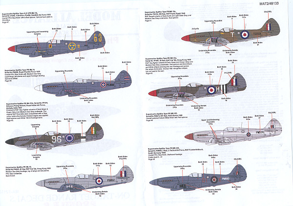 The third sheet is for Griffon engine Spitfires and there are eight schemes provided in this sheet, some of them for non RAF aircraft. With the possible exception of the Fujimi PR XIVe and XIX, the kits listed for these markings are either short run or resin.