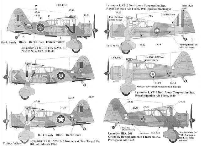 Next a pair of Royal Egyptian AF Lizzies. The first from 1941 and in desert camouflage of Middle Stone/Dark Earth over Sky. The Sky underside is a bit unusual as it was normally Azure. Also of interest is the yellow surround to the fuselage roundel and the tall fin stripes. The other REAF Lysander (from 1940) is in overall silver dope. Both aircraft are fitted with sand filters on the carb intake.