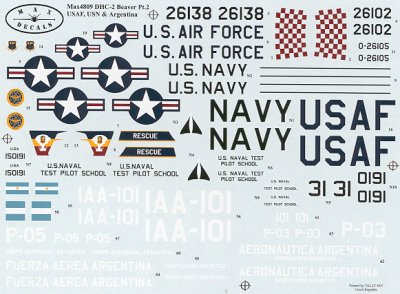 This is the second sheet on the DHC-2 Beaver from Max Decals in 1/48. This particular sheet still has some polar aircraft, but concentrates more on US military Beavers, specifically the USN and USAF.