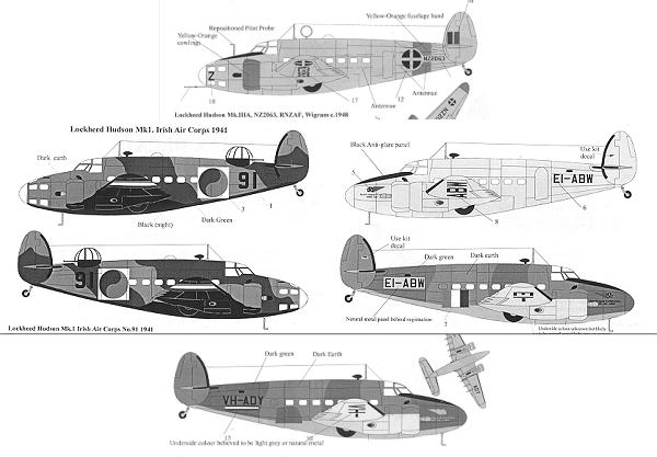 First off there are two military Hudsons on the sheet. A camouflaged Mk I from the Irish Air Corps in 1941. The other is a Mark III from the New Zealand AF air rescue service from 1948. This one is in overall natural metal and without the turret.