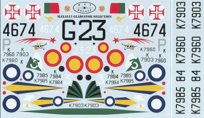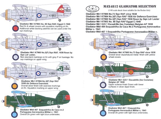 With the recent release of the Roden Gladiator kit, there has been an influx of interest in the type. Max Decals has added a super sheet to its line of quality decals with this most recent Gladiator release. The markings are for the Roden kit, but should work equally as well on the Pyro/Inpact/Lindberg kit since they are similar. A nice addition to the Max line is that the decal placement guide is now in color.