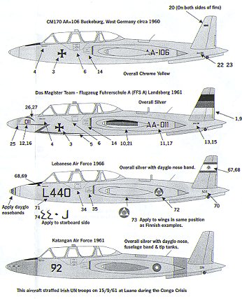 As mentioned in the review of the 1/48 sheet, the Magister is an aircraft that has been widely exported. Not only that, but it has been 'recycled' rather successfully as well. Often times aircraft have been pulled from service and still have a number of useful years left on the airframe. Customers for these planes are sought and when sold, the airframes are thoroughly reworked and rehabbed as needed before sending them on. Several of the aircraft on this sheet fall into that category.