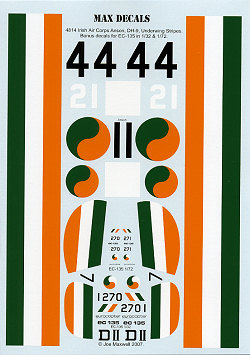 As a bonus, there are markings in 1/72 and 1/32 for an Irish Air Corps EC-135 helicopter. #270 is in an overal dark green (RAL 6031) and has a small radome and rescue hoist. It also carries cable cutters. The Revell kit is recommended for this one.