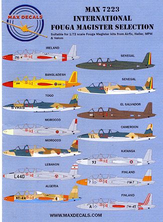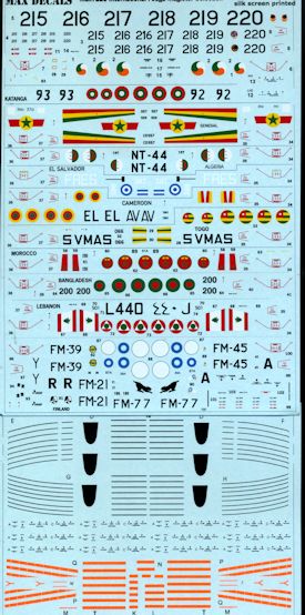 For the last two options we have an aircraft from Lebanon, and one of the few places to manufacture the Magister, Finland. For the Finnish optionthere are several serials and one of the options makes use of all the da-glo stripes on the smaller second sheet. As you can see, Max Decals has provided nose anti-glare panels as well as data markings and black stripes used on several of the various options.
