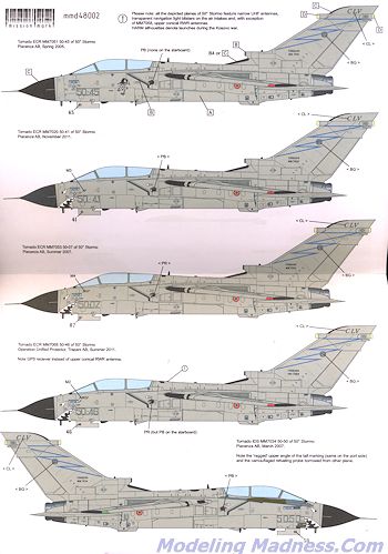 Decals are superbly printed and come with a complete stencil suite. The set includes an instruction sheet dedicated just to stencil placement. There are enough of these and common markings for a single aircraft. Instructions not only provide basic markings placement, but there are notes on each aircraft option regarding things like antenna type and placement, which is not the same on all planes. I have shown just two of the four pages of decal placement as they are so similar. For kits, Mission Mark recommends the Revell Tornado as that is what the markings are sized for. They should also fit the ancient Italeri/ESCI kit and the Trumpeter version as well. Personally, I wouldn't use the ESCI kit as it is just too old and lacks a lot of detail.