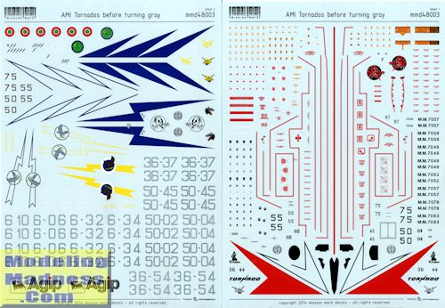 This is Mission Mark's third decal set and like the previous two, is superbly done. This set concentrats on Italian Tornado IDS aircraft in the scheme used from 1991 until 2011 when the greys scheme came into vogue. This is not the first scheme as earlier planes had large insignia and codes, though they were in the green/grey camouflage scheme. Though the aircraft is being phased out in Germany and the UK, I would imagine that the Italians will keep there for a longer period of time. They always seem to get a decade or so more out of their planes than some other countries.
