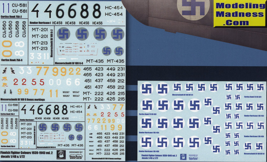 Most of these planes were flown by some of the top scoring aces of the Finnish AF and they cover from 1941 until the end of the war. Though six aircraft are featured, there are many other markings included in the sheet. For instance, there is another Hurricane, two more Hawk 75s and eleven more Bf-109Gs. The set includes two sheets with one being all insignia and the other the unique markings as well as one set of darkened insignia.