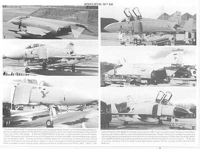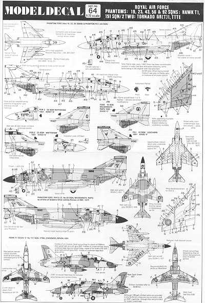 Enough background, let's take a look at a sample sheet. This one is #64 (the last sheet I have is #117, SEAC roundels, so if they went higher, I have no info on what the subjects were). This sheet was produced in 1982, making it twenty years old. There are seven possible models hidden in the sheet. First of all there are three basic types; the Phantom , Hawk, and Tornado. Modeldecal rarely did US aircraft as Microscale was busy covering those aircraft.