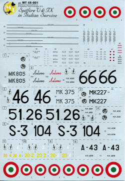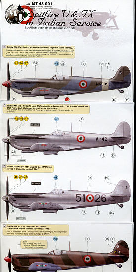 The decal sheet has enough roundels to do two aircraft and a goodly selection of stencils as well. Recommended kits are ICM and Airfix. I imagine the Hasegawa kit is not recommended due to it being 4 scale inches short. However, if you have a Mk.IX kit in 1/48, you can use these decals. For the Spit V, the Tamiya kit is recommended.